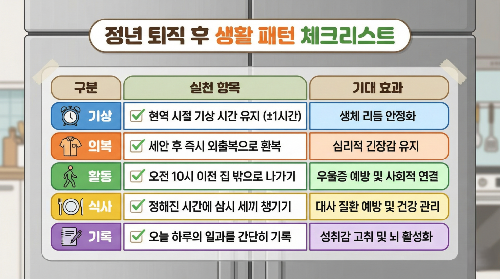 정년 퇴직 후 무너진 패턴을 바로잡고 싶다면, 아래 체크리스트를 냉장고에 붙여두고 매일 확인해 보세요.