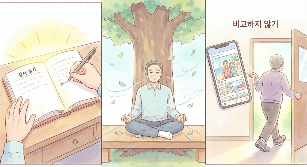 매일 밤, 그날 있었던 일 중 감사한 일 3가지만 적어보세요. 거창한 것이 아니라 “오늘 따뜻한 햇살이 좋았다”, “버스 정류장에 가자마자 버스가 왔다”, “아내가 끓여준 된장찌개가 맛있었다”처럼 사소한 것이 좋습니다.