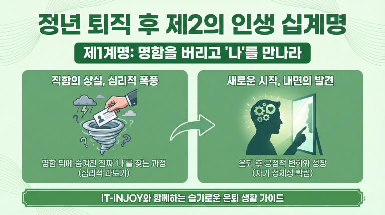 안녕하세요, IT-INJOY입니다. 정년 퇴직 후는 인생의 마침표가 아니라 새로운 문장의 시작입니다. 하지만 그 문장을 제대로 쓰기 위해서는 반드시 거쳐야 할 관문이 있습니다. 바로 ‘명함 뒤에 숨겨진 진짜 나’를 찾는 과정입니다. 오늘은 은퇴 후 가장 먼저 찾아오는 심리적 폭풍과 이를 슬기롭게…