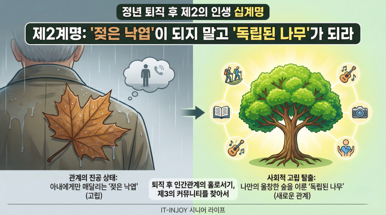 안녕하세요, 시니어의 활기찬 내일을 응원하는 IT-INJOY입니다. 지난 시간, 우리는 퇴직 후 명함을 버리고 진짜 나를 마주하는 ‘심리적 홀로서기’에 대해 이야기했습니다. 오늘은 그 두 번째 시간으로, 인간관계의 홀로서기를 다뤄보려 합니다. 정년 퇴직 후 가장 먼저 겪는 변화가 내면의 폭풍이라면, 두 번째는…