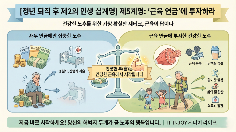 안녕하세요, 시니어의 건강하고 스마트한 삶을 제안하는 IT-INJOY입니다. 우리는 정년 퇴직 후 ‘국민연금’, ‘퇴직연금’, ‘개인연금’ 등 자산 관리에 온 신경을 집중합니다. 하지만 정작 가장 중요한 연금을 놓치고 있습니다. 바로 **‘근육 연금’**입니다. 통장에 수억 원의 잔고가 있어도, 내 다리에 힘이 없어 침대에만…