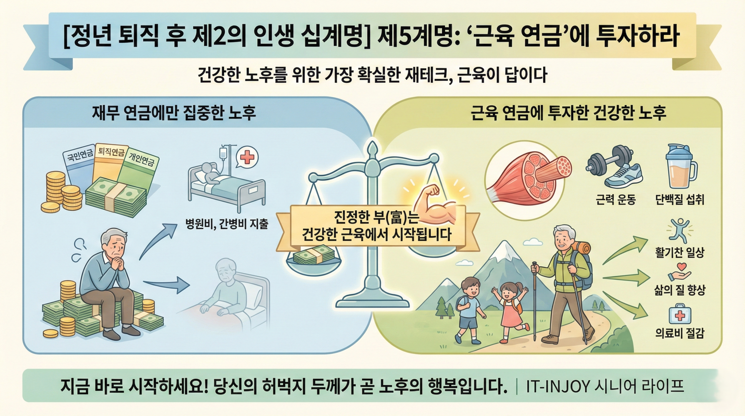 오늘은 [정년 퇴직 후 제2의 인생 십계명] 그 다섯 번째 시간으로, 노년의 삶의 질을 결정짓는 가장 확실한 재테크, ‘근육 관리’에 대해 실제 사례를 곁들여 심층적으로 다뤄보겠습니다.