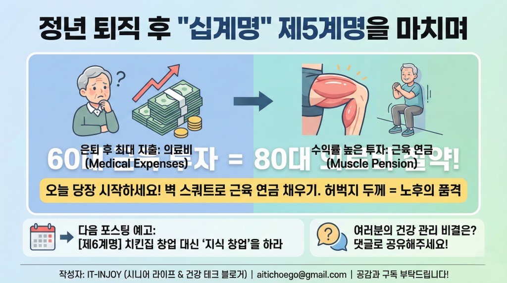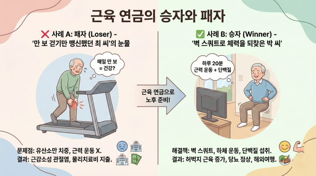 바로 **‘근육 연금’**입니다. 통장에 수억 원의 잔고가 있어도, 내 다리에 힘이 없어 침대에만 누워 지내야 한다면 그 돈은 그저 숫자에 불과합니다.