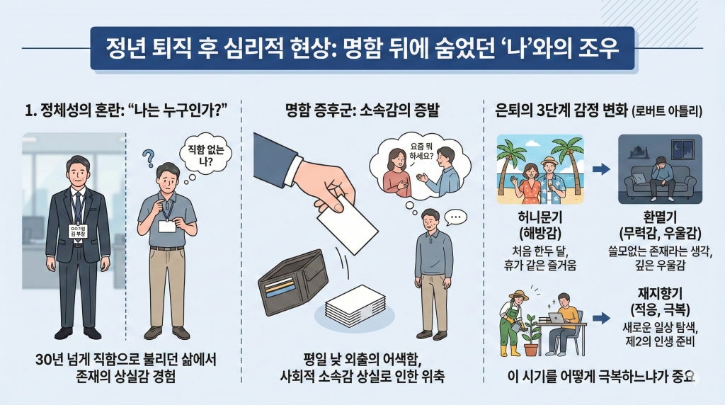 평일 낮 시간에 정장을 입지 않고 길을 나서는 것 자체가 어색해지며, 누군가 “요즘 뭐 하세요?”라고 물을 때 답변할 말이 마땅치 않아 외출을 꺼리게 됩니다. - 은퇴의 3단계 감정 변화: 로버트 아틀리(Robert Atchley)는 은퇴 후 심리를 **허니문기(해방감) → 환멸기(무력감) → 재지향기(적응)**로 구분했습니다.